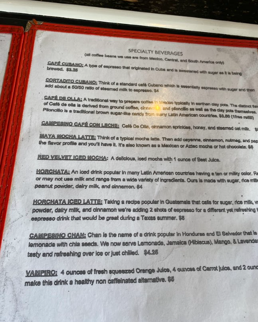 The menu is heavily South American influenced, with their coffee beans strictly originating from Mexico, and central/south america. My favorite being the horchata ice latte. The cinnamon and latte combination brings out a new perfective to my latte experience. While their other items such as the Maya Mocha Latte and Cafe De Olla also brings out a unique coffee profile I have yet to experience.